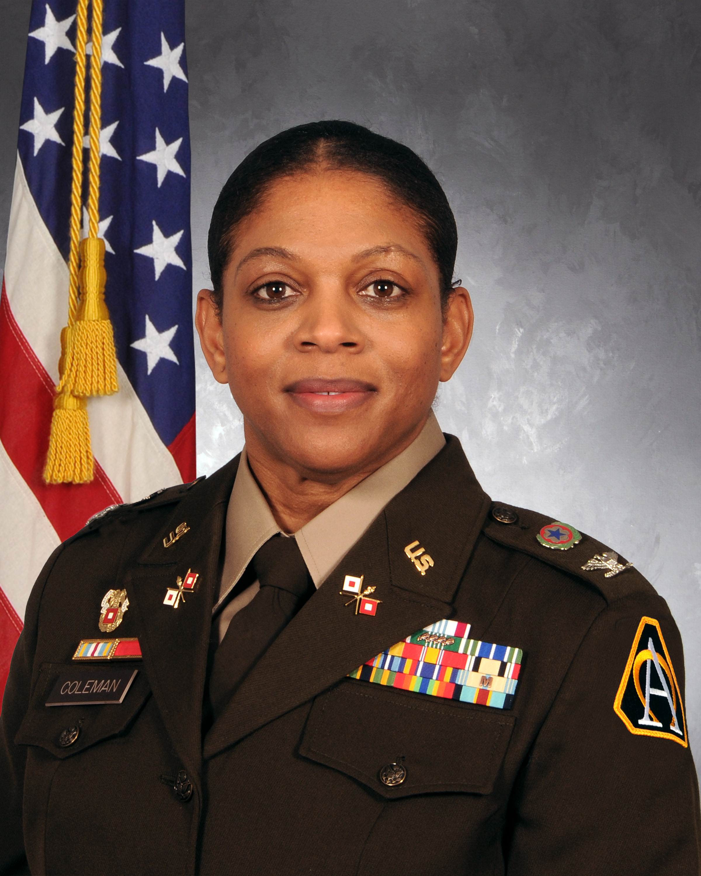 Her military education includes Signal Officer basic and advanced courses, Adjutant General advanced course, and U.S. Army Command & General Staff College. Colonel Coleman has served in the Army for over 26 years including both the enlisted and officer ranks. She has held numerous command and staff positions in various logistics, signal, acquisition, and operational assignments over the course of her career. She served a combat tour in Iraq in support of Operation Iraqi Freedom (OIF) in 2008 with the 3rd Sustainment Command as a Company Executive Officer. Other previous assignments include: Platoon Leader for the 212th Signal Battalion; Automations Officer and Assistant Brigade S6 for the 77th Aviation Brigade; Assistant Force Integration Readiness Officer; OCS Training, Advising and Counseling (TAC) Instructor, HHC Company Commander with the 233rd Regional Training Institute; Contingency Contracting Management Officer; Resource Management & Organizational Readiness Instructor at the NGB Professional Education Center; Mission Command Systems Coordinator and Requirements Analyst at NGB; Assistant Product Manager for the Commander's Risk Reduction Program, Deployed Theater Accountability System (DTAS), and the Tactical Personnel System (TPS) at PEO Enterprise; and Acquisition Career Manager.