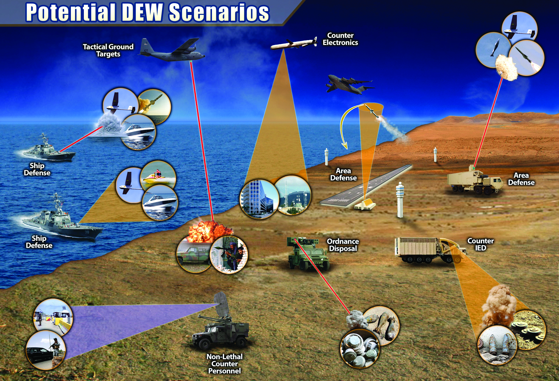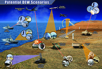 A Directed Energy Weapon (DEW) emits a surge of energy capable of disabling a target such as electronics in vehicles, communications equipment, or other weapons.